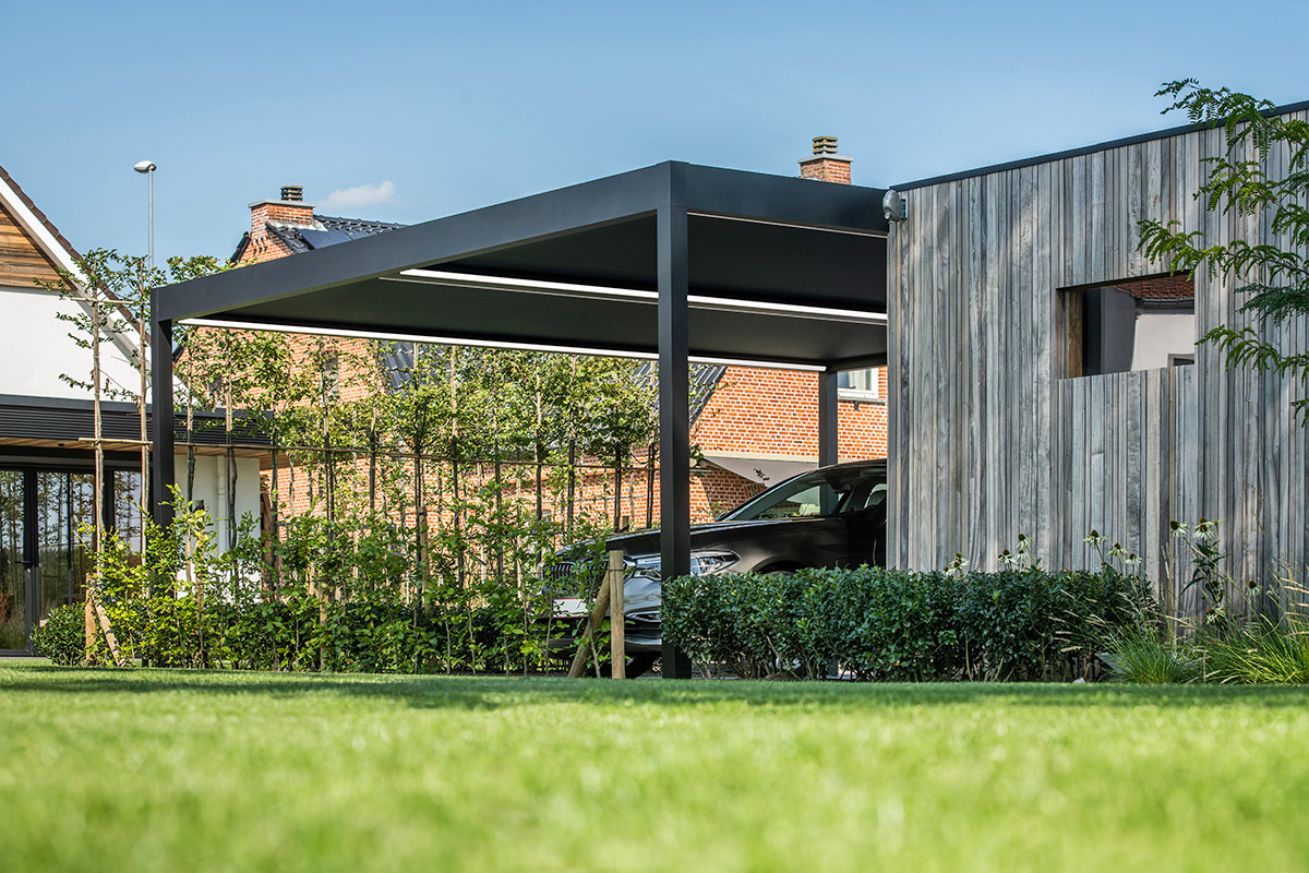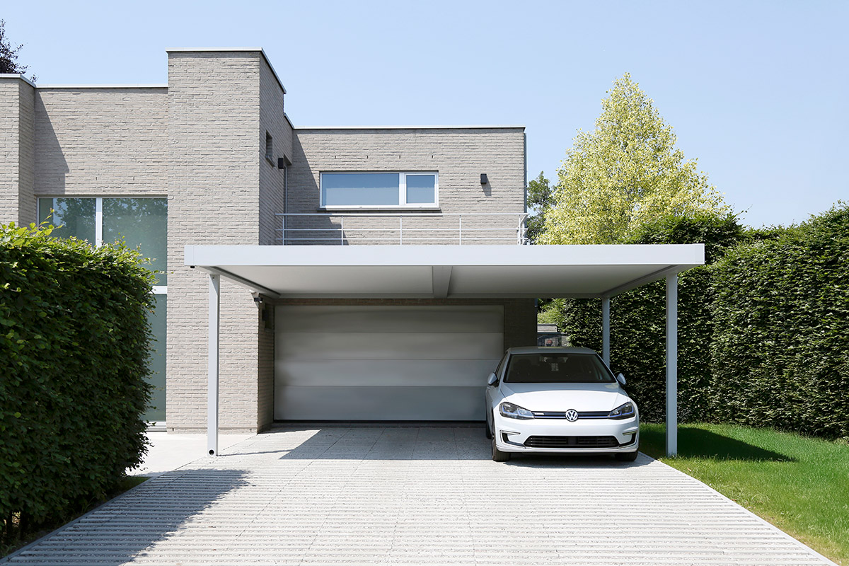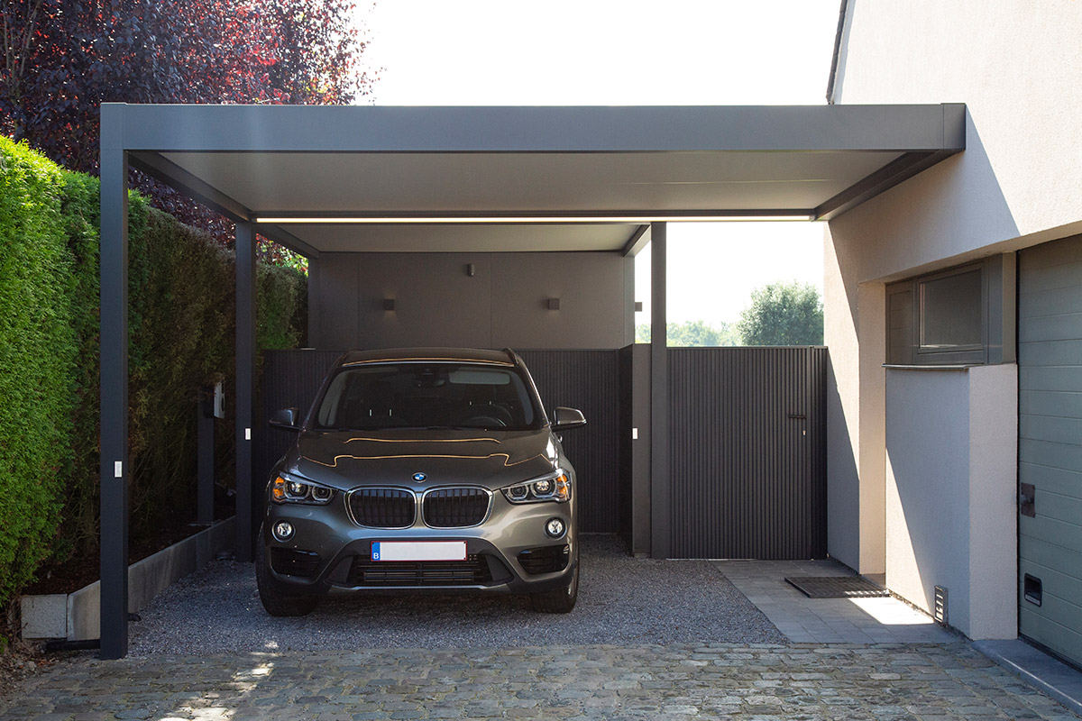 Vous pouvez aussi le faire aller jusqu’à la porte d’entrée de façon à être protégé des intempéries. Ce carport peut s’assortir de parois fixes et de nombreuses options intégrables.