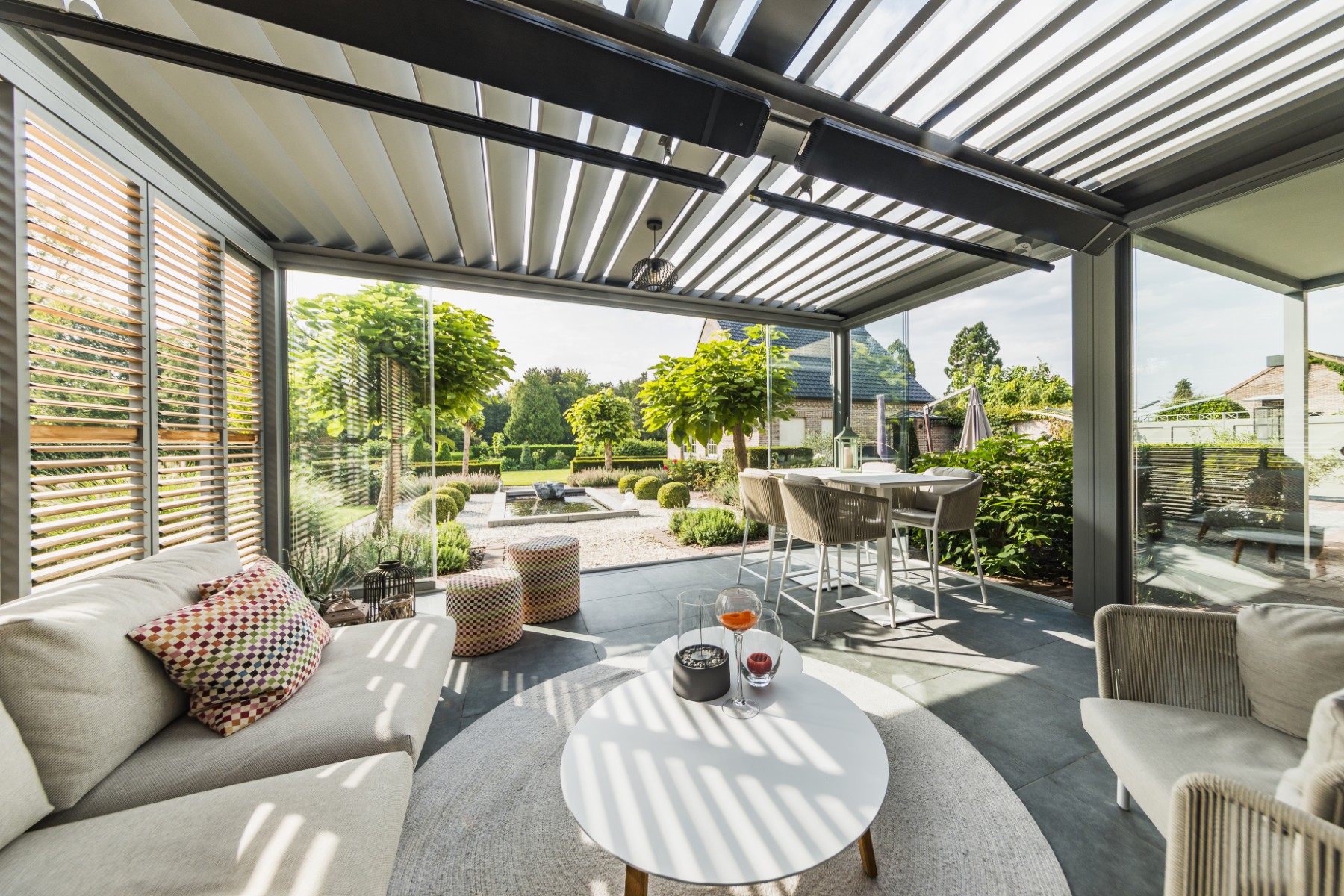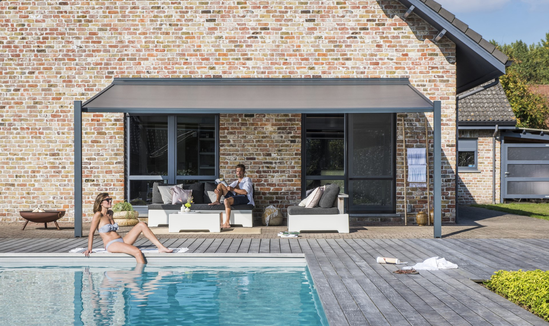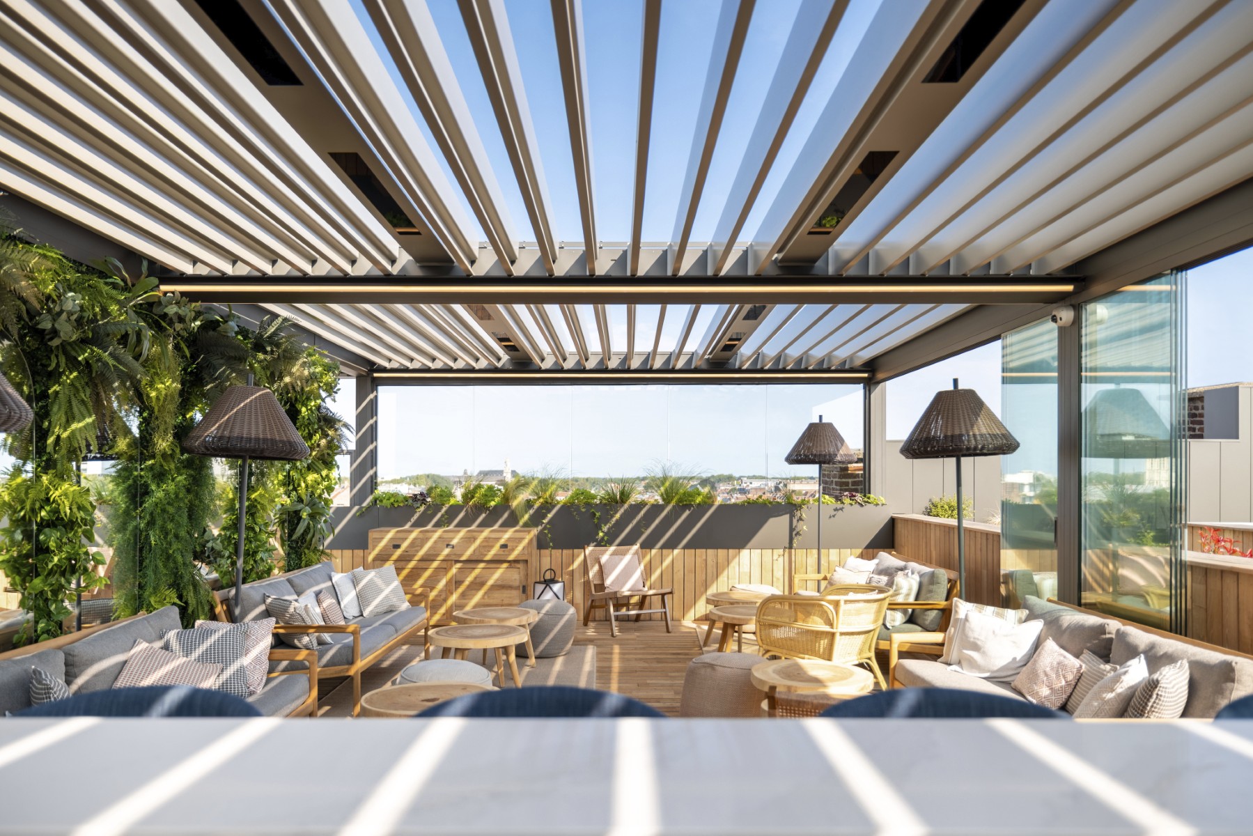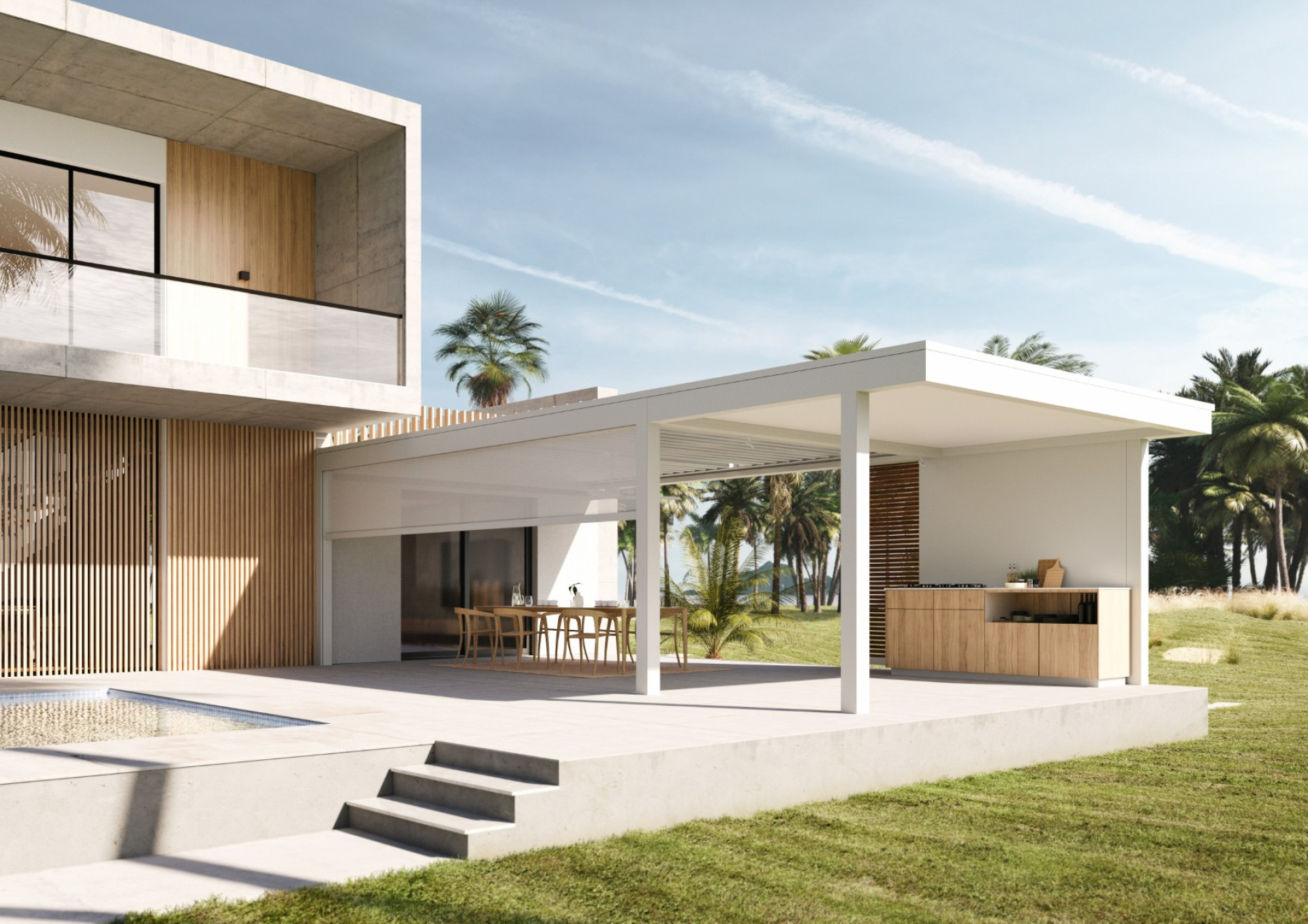 La Camargue Skye de Renson, offre une gestion optimale de la lumière et de la ventilation, grâce à sa toiture bioclimatique et rétractable. L’innovation de la technologie S-Drive de l’entrainement des lames assure un produit d’excellence pour un confort haut de gamme et durable.