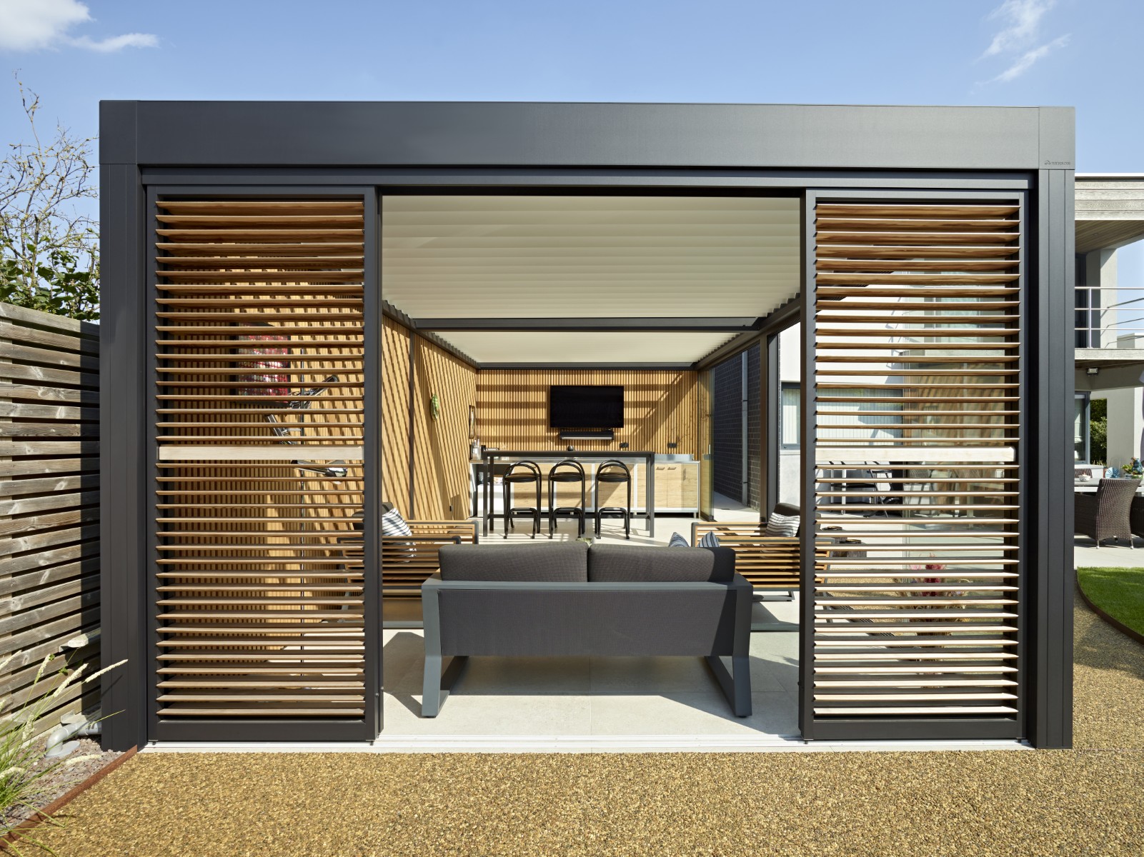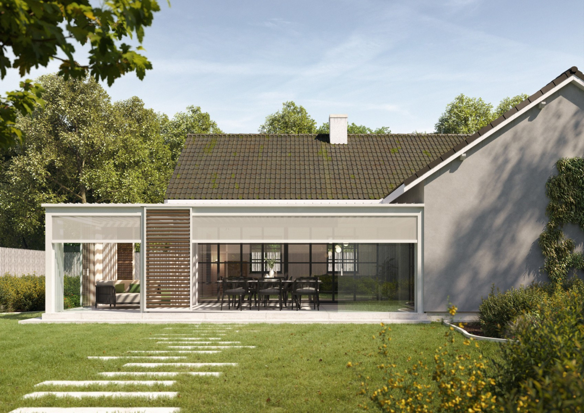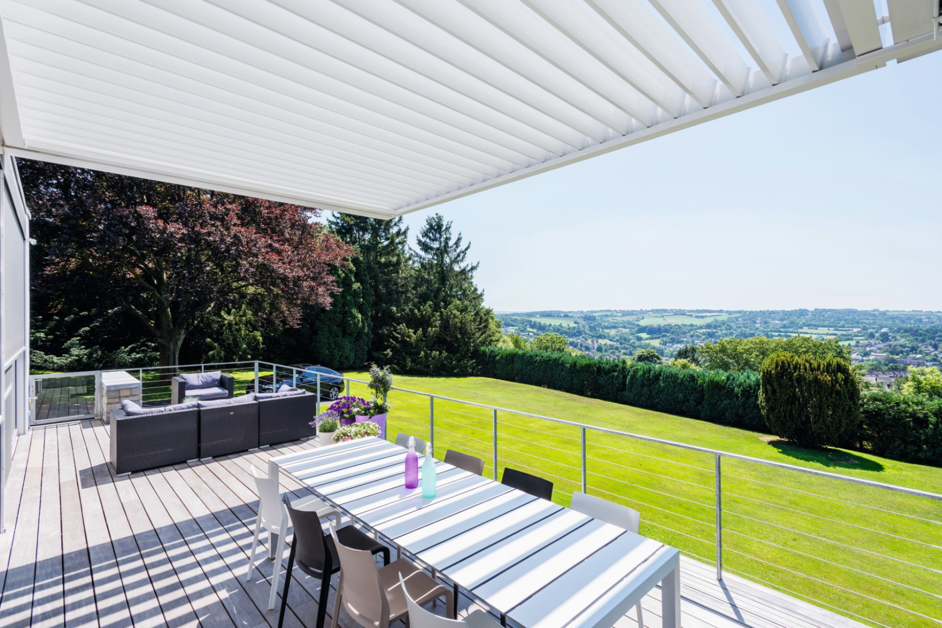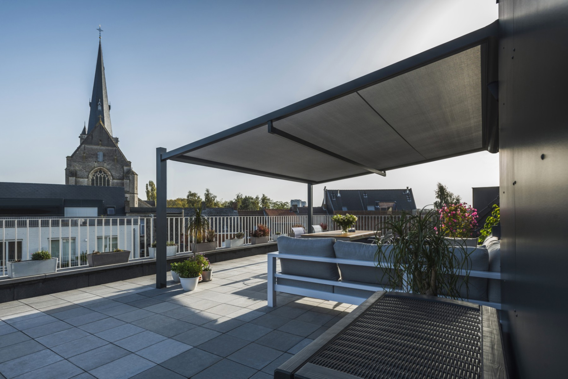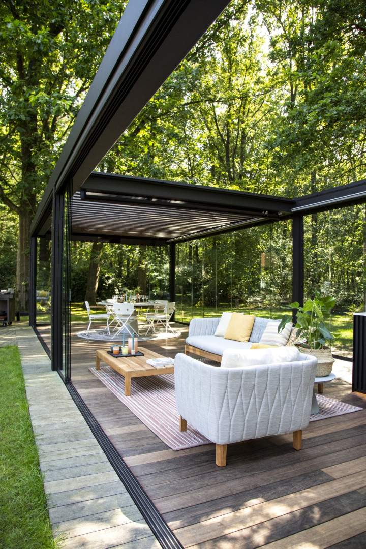 La toiture bioclimatique Aéro de Renson s’intègre dans une structure existante et permet de moduler la lumière, la ventilation et l’ombrage pour créer le climat idéal sur votre terrasse. Sa personnalisation poussée permet une intégration parfaite à son support pour un confort absolu en toute saison. Aéro dans sa version Skye est rétractable pour une ventilation optimale.