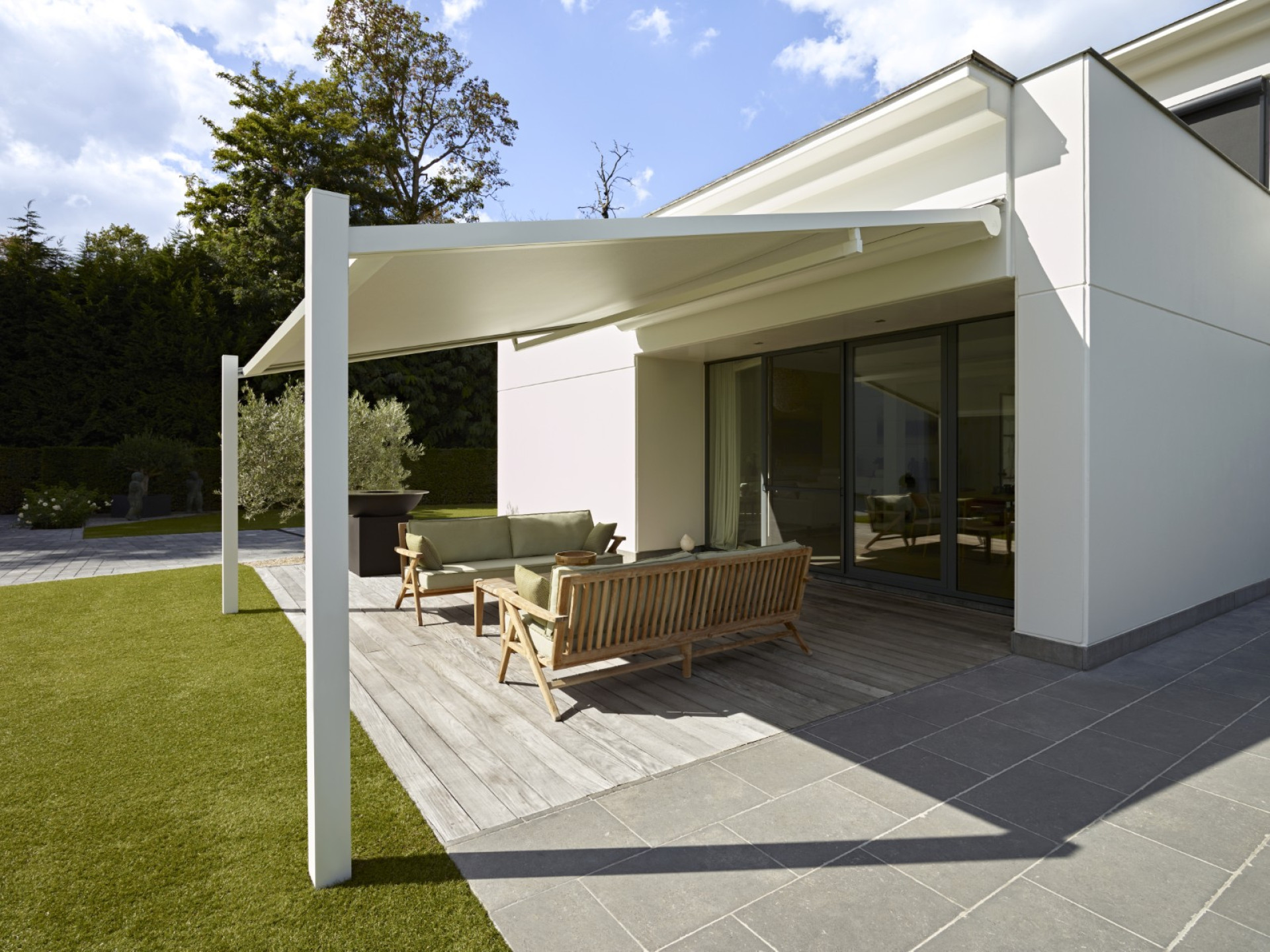 Le toit en toile rétractable de la pergola Lapure de Renson s’ouvre entièrement pour obtenir une vue panoramique. Sa structure minimaliste s’intègre parfaitement à toute architecture et offre une solution raffinée et modulable pour profiter pleinement de votre terrasse en créant l’ombre ou l’ensoleillement souhaités.